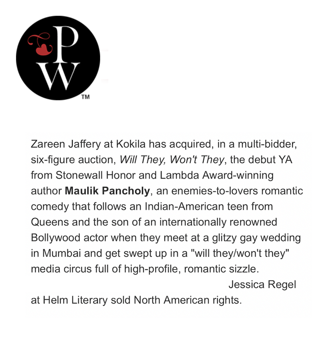Pancholy’s debut YA Romance, WILL THEY, WON’T THEY releases Spring 2027 from Kokila Books/Penguin Young Readers.